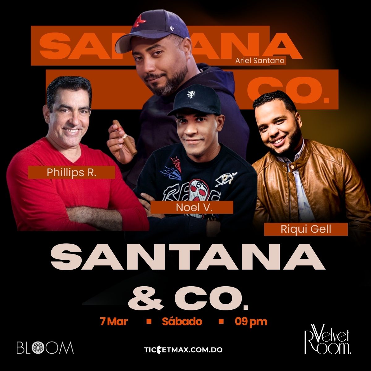 🎤 Santana & Co. presenta una noche de Stand-Up Comedy premium — Phillips Rodríguez, Noel Ventura y Riqui Gell llegan al Velvet Room @ Bloom para una tanda de risas que no vas a olvidar.